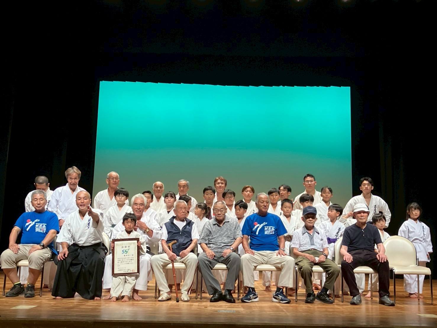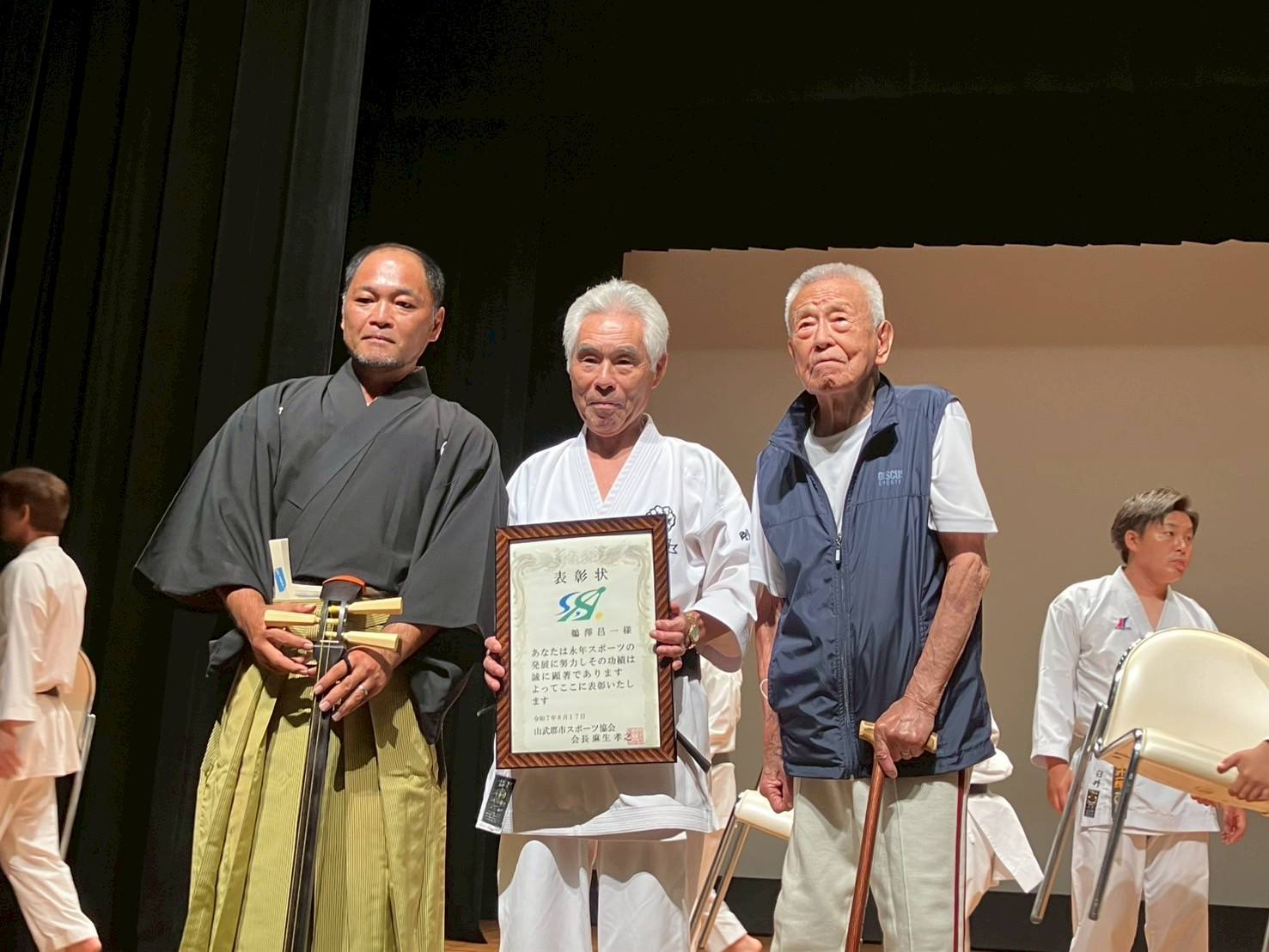 鵜沢昌一先生が山武郡市スポーツ協会より、永年の空手の普及発展に寄与したことに対し、スポーツ功労表彰が授与されました。 恩師の増田一郎、山武郡市空手道連盟筆頭常任相談役も駆けつけてくれました